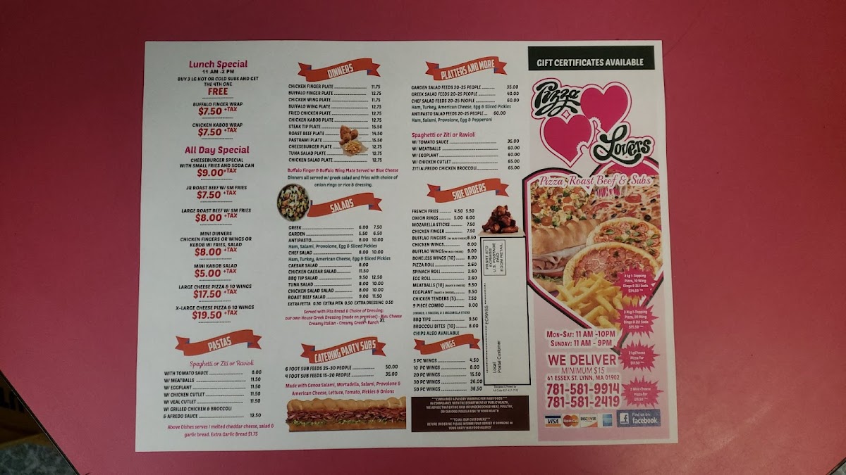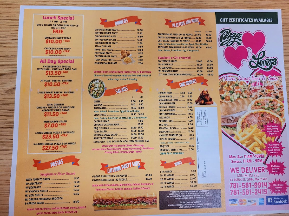 The menu at Pizza Lovers offers a straightforward, comforting selection that suits both casual lunches and relaxed dinners. With an emphasis on classic and gourmet pizzas alongside hearty salads and satisfying subs, it’s the kind of place where familiar flavors meet welcoming, laid-back dining.